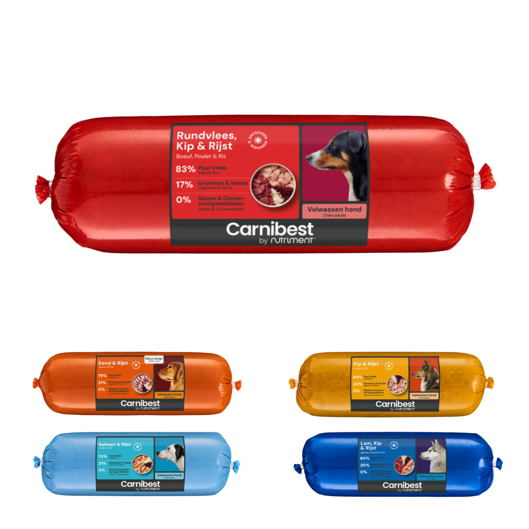 Carnibest by Nutriment bevat geen varkensvlees en geen botten van runderen of schapen. Wat het wel bevat, zijn hoogwaardige ingrediënten zoals vers kippenvlees (filet, hart, maag, lever, nek, bot), vers rundvlees (spiervlees, pens, hart, lever, nier) en vers lamsvlees (spiervlees, pens, hart, lever, nier). Veel van deze grondstoffen zijn deels afkomstig van biologisch gehouden dieren.