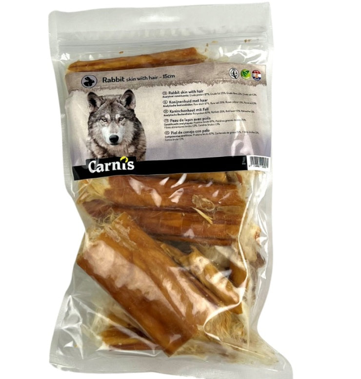 Carnis konijnenhuid is een magere kauwsnack. In de verpakking zitten meerdere dunne stukjes huid. Door het fijne formaat is de huid ook ideaal voor pups en kleine rassen.