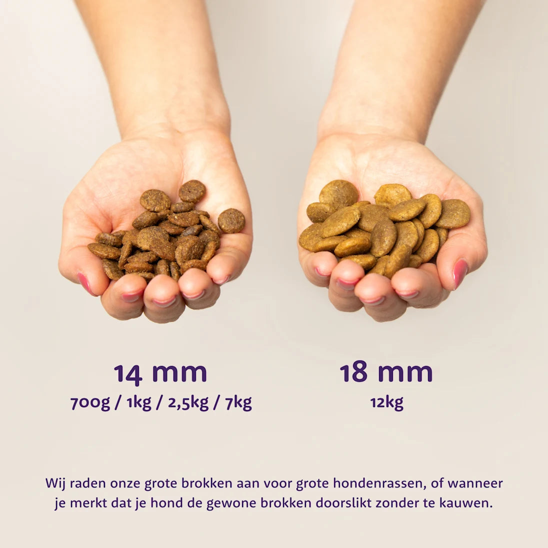 Deze mix met vers vlees en verse vis is om van te kwijlen (van goesting, niet van ouderdom). Toch zijn deze brokjes een aanrader voor oudere honden. De verse zalm met omega 3 houdt het brein scherp. En de kip is mager en caloriearm. Ideaal om van een luilekkere oude dag te genieten. Heeft je senior een gevoelige maag? Geen zorgen, onze brokjes met Verse Scharrelkip en Noorse Zalm zijn graanvrij en dus makkelijk te verteren.