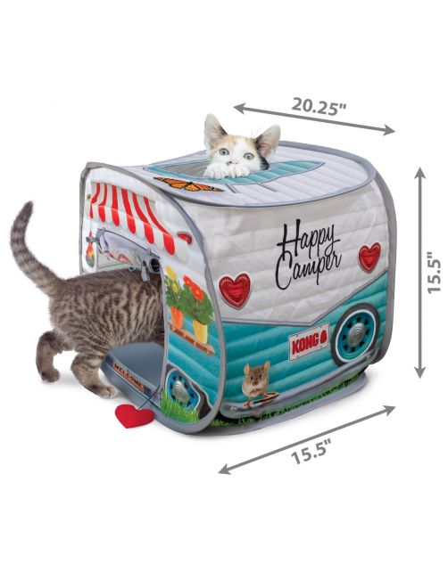 De KONG PlaySpaces Camper is een avontuurlijk kampeerverblijf voor katten dat inspeelt op hun natuurlijke behoefte om zich te verstoppen en te spelen. Met een raam, deur en schuifdak kan je kat zich verstoppen, rondkijken en spelen, waardoor het jacht- en nieuwsgierigheidsinstinct wordt gestimuleerd. Het bungelende speeltje en het KONG North American Premium Catnip verhogen het speelplezier en de betrokkenheid. Het flexibele ontwerp uit één stuk maakt de camper eenvoudig op te zetten en weer op te bergen.