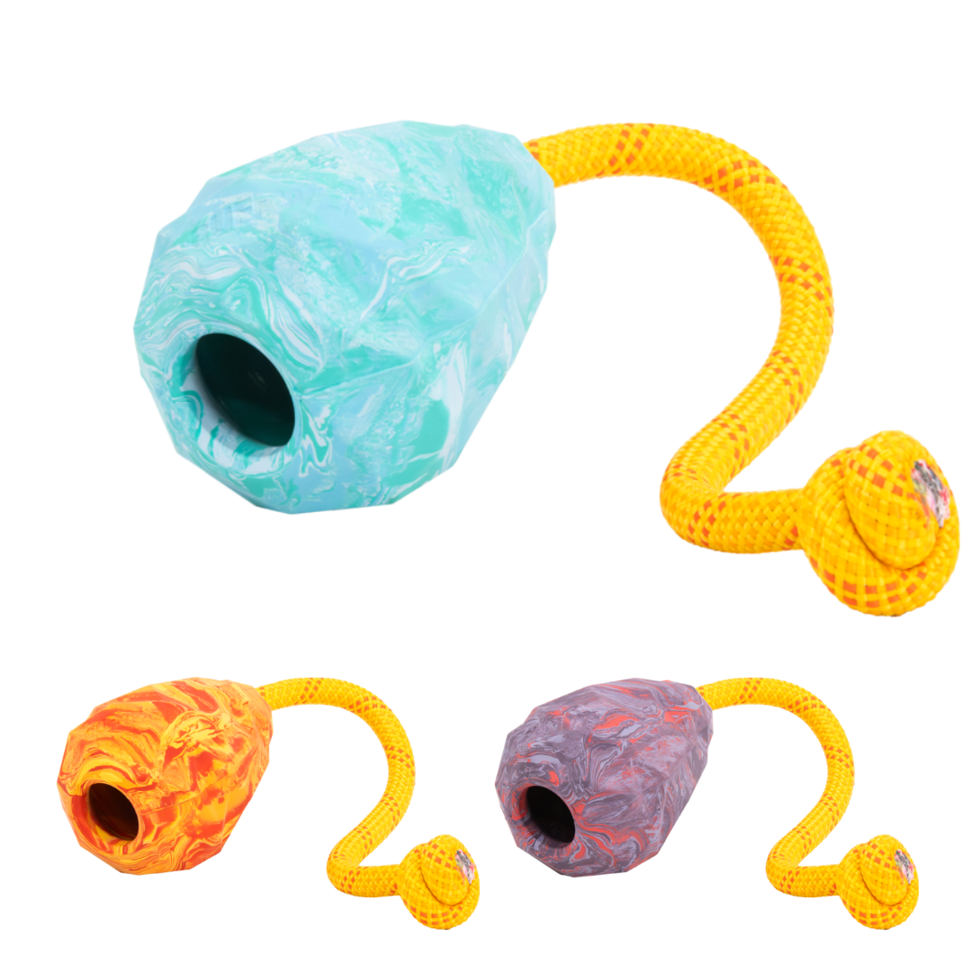De kegelvorm is gemaakt van natuurlijk latexrubber, sterk genoeg voor intensieve speelsessies en bestand tegen stevige kaken. Het handvat van het touw kan na verloop van tijd slijten, maar dankzij het slimme ontwerp kun je het touw eenvoudig vervangen door je eigen koord – zo gaat het speeltje langer mee.