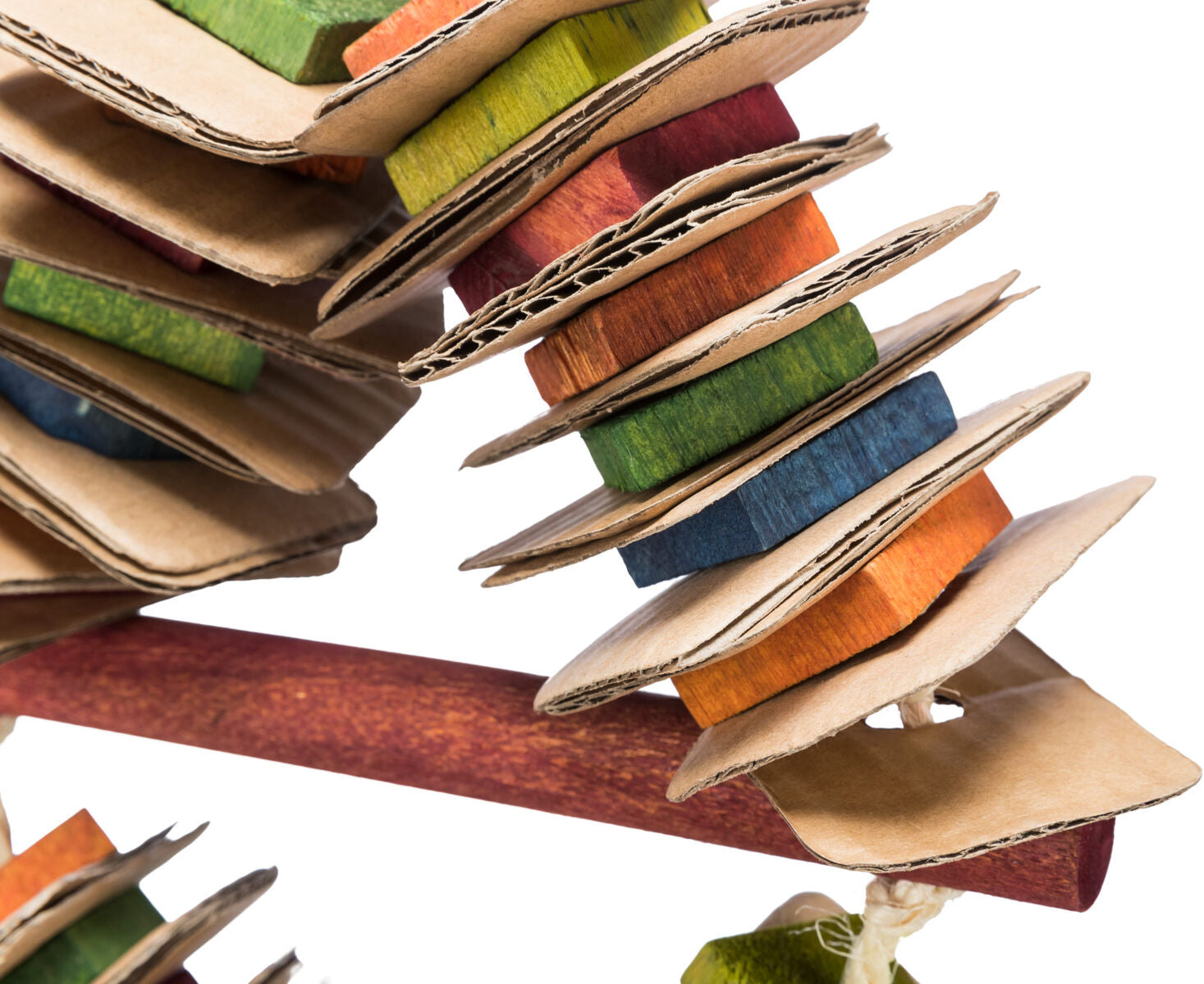Dit knabbelspeelgoed is speciaal ontwikkeld om vogels actief en bezig te houden. De combinatie van karton en houten blokjes nodigt uit tot knagen, trekken en slopen – precies wat veel vogelsoorten van nature graag doen.